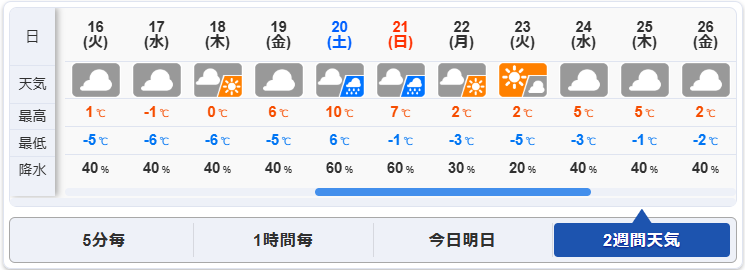 また週末には予想最高気温が10℃の日があり、その前後も軒並みプラス気温に!ただ、20日土曜日を除いて最低気温はマイナスのままなので温度差による体調の変化にも要注意です!