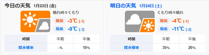 最高気温は、札幌でー3℃、旭川-6℃、函館-4℃です。