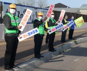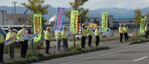 札幌市西区宮の沢1条1丁目1−3交差点にてトラック協会札幌西地区主導の下、およそ30分間ではありましたが各協力会社さんと協力してドライバーさんや通行人の皆さまへ交通安全への意識を高めていただけるように街頭活動を行いました。