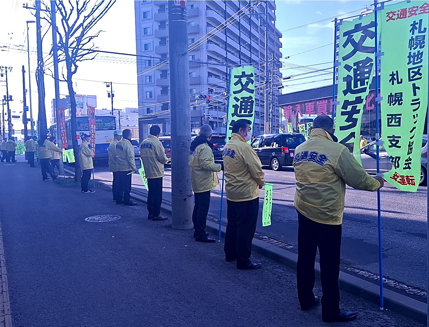 札幌市西区宮の沢1条1丁目1−3交差点にてトラック協会札幌西地区主導の下、およそ30分間ではありましたが各協力会社さんと協力してドライバーさんや通行人の皆さまへ交通安全への意識を高めていただけるように街頭活動を行いました。